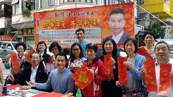大公網1月7日訊 農曆新年就嚟到喇,唔少立法會議員同區議員都鍾意擺嚇街站,寫揮春俾街坊看門口,同大家共渡新歲。工聯會郭偉強(阿強)今日就喺北角和富中心擺街站,同街坊朋友拜個早年。不過未搵到阿強寫揮春嘅朋友都唔駛怕,阿強嚟緊星期六下晝同下星期一嘅上晝仲會分別喺新光戲院門口同渣華道街市門口再寫過,有興趣嘅朋友記得到時去攞返張喇!