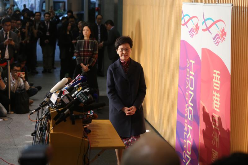 圖:林鄭尋日開記者會有「飛龍」布景唔係「大細超」/大公報記者何嘉駿攝