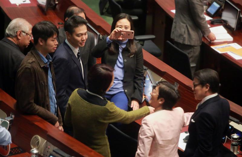 反對派真係搞開有條路,搞完會議連做直播都唔放過!民建聯主席李慧琼(Starry)喺直播向觀眾講緊事態嘅最新發展,呢個時候人民力量嘅陳志全竟然拎住印有特首梁振英同宣布參選嘅林鄭月娥道具埋嚟「攝鏡」,又喺後面大嗌大叫,民主黨黃碧雲(一舊雲)見到又過嚟追住Starry講嘢,仲鬧民建聯副主席陳克勤,話佢係「擦鞋仔」先有得問問題喎。克勤之後喺直播好客氣咁幽佢一默,話一舊雲原來做咗咁耐議員都唔識撳掣輪候發言,真係笑大人個口。