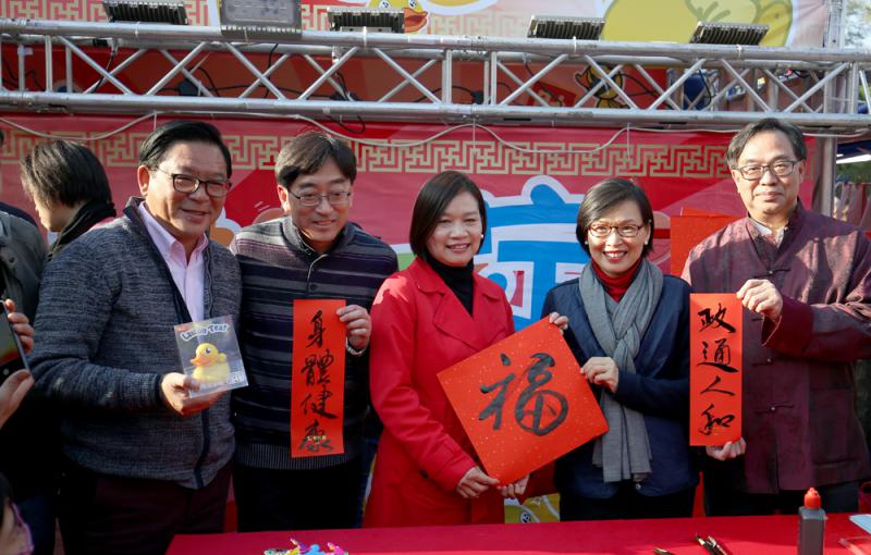 維園年宵尋日開鑼,多個政黨都有擺檔,食物及衛生局局長高永文尋日就去咗經民聯攤位撐場。經民聯主席盧偉國話,今年年宵主題就係一隻膠鴨,檔名都叫「香港一定duck」,而呢隻鴨仔喺香港好出名,有70年歷史,代表香港工業騰飛,經濟奇跡,今次希望事事亨通,樣樣都duck(得)!高局長就話,其實佢細細個都有玩呢隻鴨仔,同時覺得呢隻鴨仔好有意義,希望香港人發揮獅子山下嘅精神,重要就係同舟共濟,同心一德,希望大家保重身體。民政事務局副局長許曉暉就祝願大家事事如意。最後高局長仲幫襯經民聯買咗三套鴨仔禮物包,當中包括鴨仔筆袋、黃色玩具鴨、鴨仔造型嘅長尾夾等等,盛惠504元。