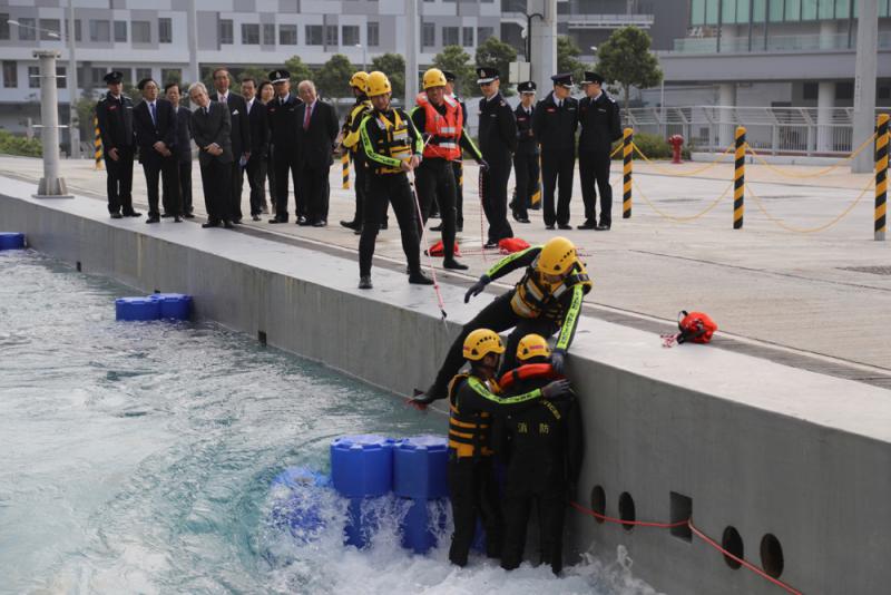 佢哋喺消防處處長李建日陪同下,參觀學院嘅模擬訓練設施,睇下學員喺模擬鐵路站、燃料庫、船隻火警和坍塌事故搜救訓練場等區域示範救援工作。呢種模擬訓練,其實可以提升消防處人員應付大型緊急事故嘅專業知識同救援技巧。
