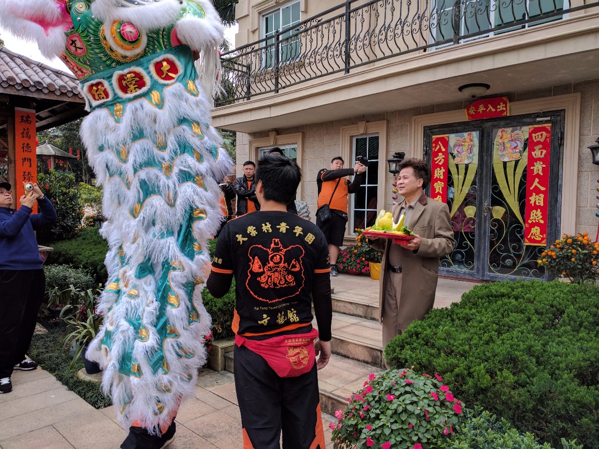 大公網2月10日訊 十八鄉鄉事委員會主席梁福元今日同傳媒團拜,鄭晴都有去湊嚇熱鬧。大棠村青年團嘅舞獅隊首先表演採青,不過就搞搞新意思,獅子將地上象徵「招財」嘅香蕉、生菜同象徵「陸續有來」嘅碌柚擺成「盤滿砵滿」送畀梁福元,真係又有創意,又好好意頭!