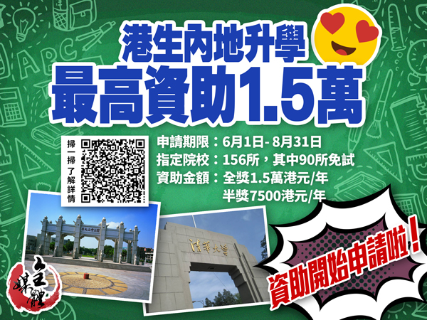 香港教育局宣布由今日(6月1日)起至8月31日接受合資格學生申請2017/18學年「內地大學升學資助計劃」。資助計劃將惠及在指定的156所內地院校修讀學士學位課程的香港學生,最高資助額可達每年1.5萬港元。