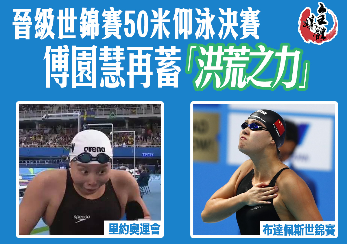 第17屆國際泳聯游泳世錦賽女子50米仰泳決賽將於香港時間7月28日凌晨舉行。里約奧運會銅牌得主、「洪荒少女」傅園慧在半決賽中以27秒19排名第二,成功晉級決賽。