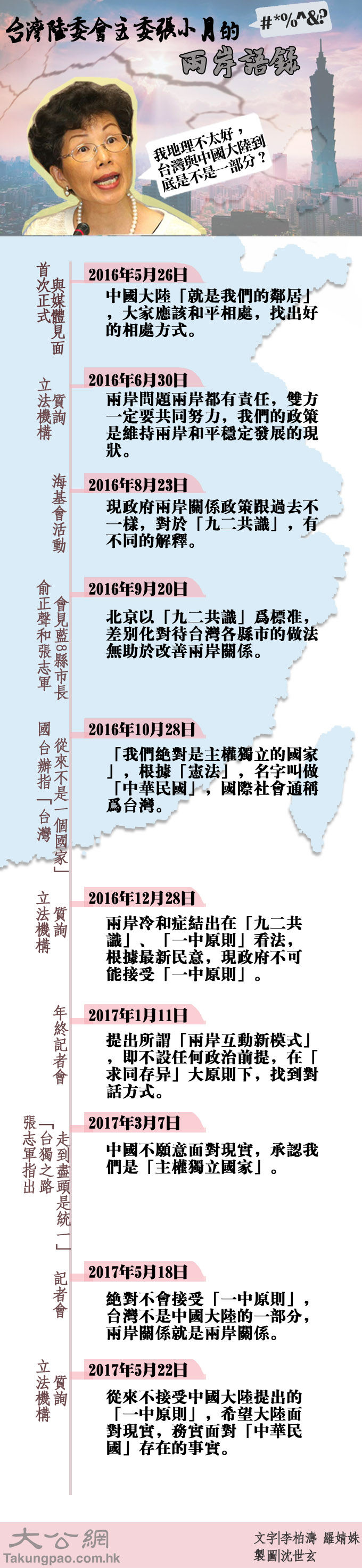 首先從地理上看,台灣是個島,本來就不是大陸一部分,不然怎會在兩岸之間橫着一道台灣海峽?在島上生活了60多年的張小月,難道連這點地理知識都沒有嗎?當然不是。其實她真正想說的是「台灣不是中國的一部分」,只是現階段,還不敢講的如此直白而已。再看,她說「我們是主權獨立國家,習慣上叫台灣,依憲法叫『中華民國』」,這不是就是民進黨「借殼上市」,偷渡「台獨」的「經典理論」嗎?