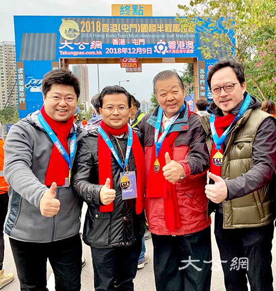 陳勇(左二)、香港國際半馬組委會主席、香港新聞工作者聯會會長張國良(右二)、全國人大代表張俊勇(右一)、大公報社長助理、大公網執行總裁兼總編輯、本次賽事組委會執行主席王文韜(左一)合影