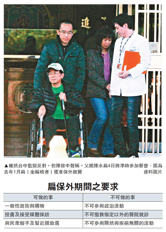 圖:雖然台中監獄反對,但陳致中聲稱,父親陳水扁4日將準時參加餐會。圖為去年1月扁(坐輪椅者)獲准保外就醫/資料圖片
