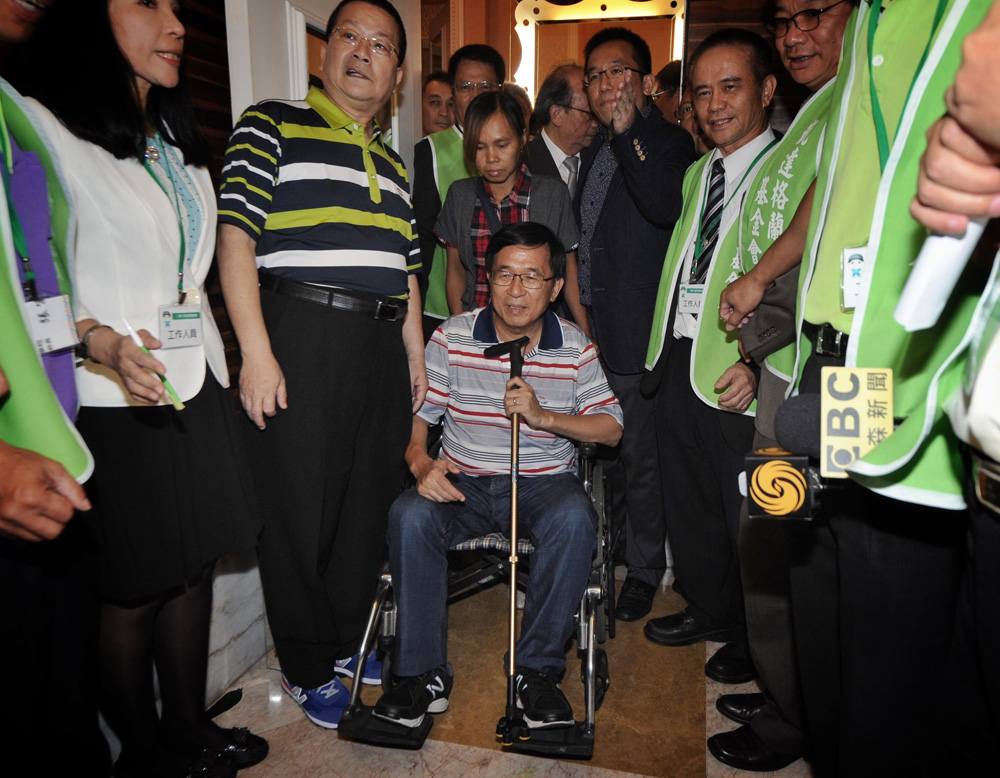 圖:陳水扁(中)4日晚間現身台北凱達格蘭基金會募款餐會會場,並在一旁的休息室會晤支持者。圖為他在層層保護下離開休息室\中央社