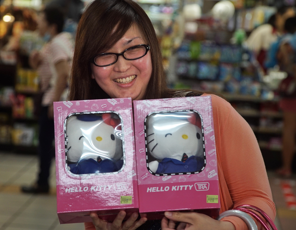 為慶祝台鐵成立129周年,台鐵7日推出“Hello Kitty 列車長絨毛娃娃”,首批限量200組,一組1398元新台幣,購得的民眾樂不可支。