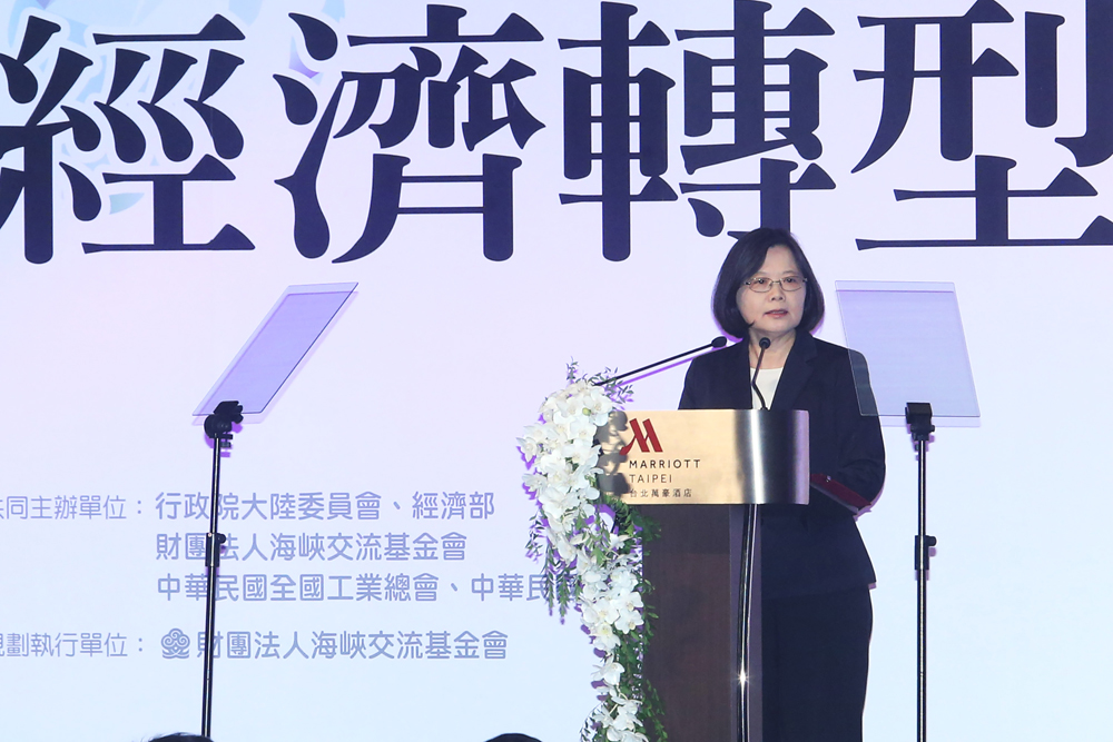 圖:台灣地區領導人蔡英文8日晚出席大陸台商端午聯誼活動時,提出要以台灣經濟轉型帶動台商回台投資”中央社