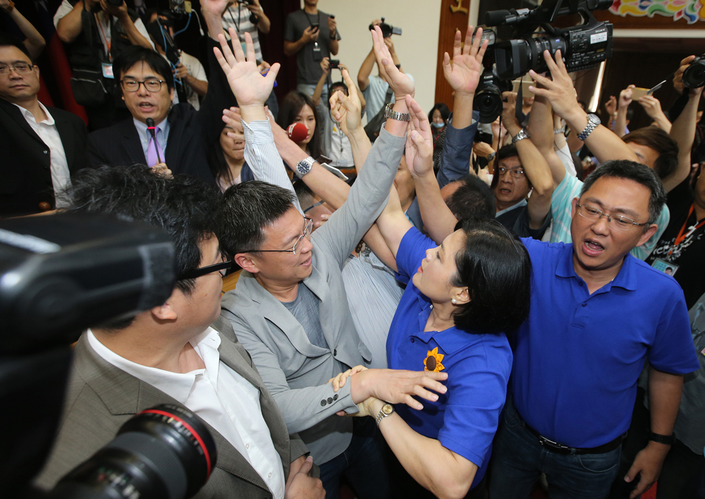 圖:“立法院”8日確認不當黨產處理條例草案議事錄,多名國民黨立委(右)不滿並上主席台前抗議\中央社