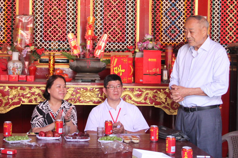圖:劉氏宗親聯誼會長劉宗凱(右)向劉世昌夫婦介紹家族悲壯發展史/大公報記者蔣煌基攝