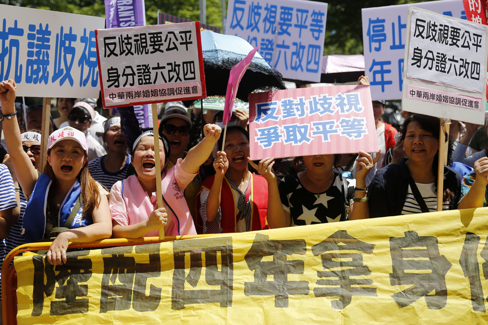 【大公報訊】據新華社台北報道:台灣地區立法機構相關委員會日前初審通過攸關大陸配偶取得身份證件年限從6年改成4年的「兩岸人民關係條例」修正草案,但民進黨黨團認為審查無效。15日,中華兩岸婚姻協調促進會、台灣新移民勞動權益促進會、中華兩岸新家庭協會等團體率領百餘名陸配,在台立法機構外集會,呼籲「要平等、反歧視」。