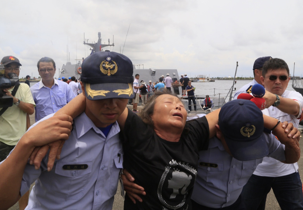 圖:台灣海軍三日出動兩艘飛彈快艇載送因飛彈誤射枉死的漁船船長黃文忠家屬,到澎湖出事地點招魂。家屬面對親人身亡,悲痛欲絕\中央社