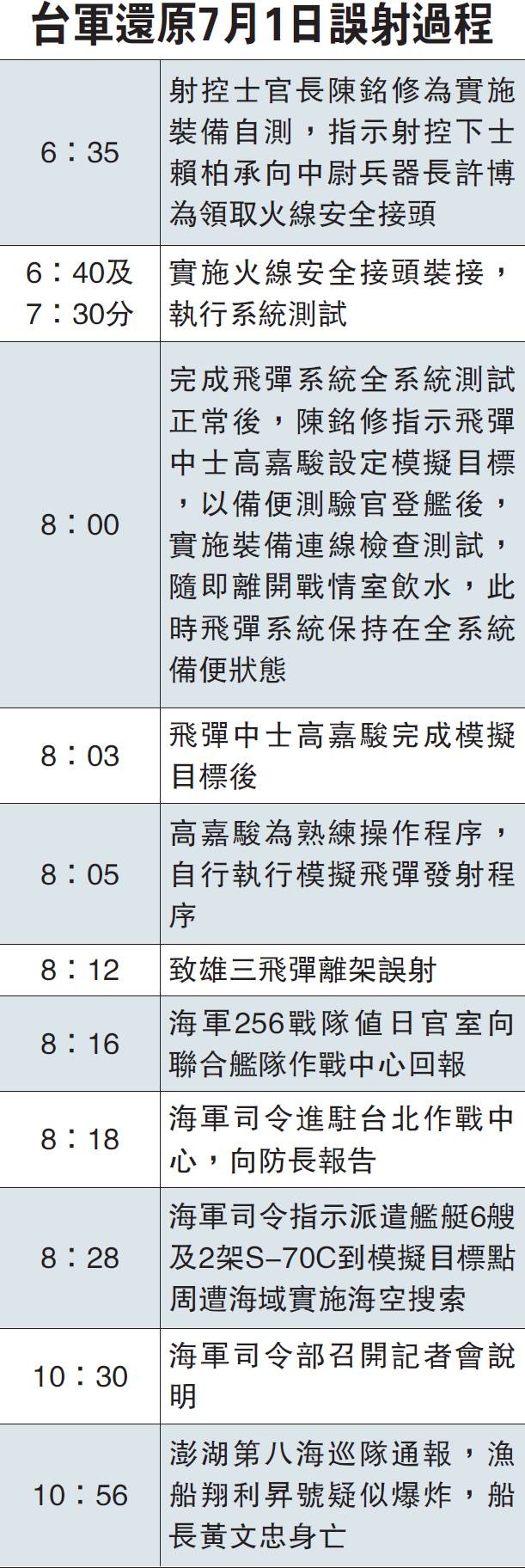「國防部」說,當日飛彈系統已完成備便後,兵器長、士官長皆未全程在場督導,與規定不符,應負事件主要責任。「國防部」強調,這是一連串違反紀律與連續犯錯所造成,「並非只是個人操作失誤的問題」。精進作為方面,「國防部」指出,將採「一級管制一級」的嚴密複式管控,從事精準武器演訓前,由幹部督導,於任務執行前、中、後確依作業程序逐項檢查,督導官、安全軍官不可擅離職守,現場全程督導。