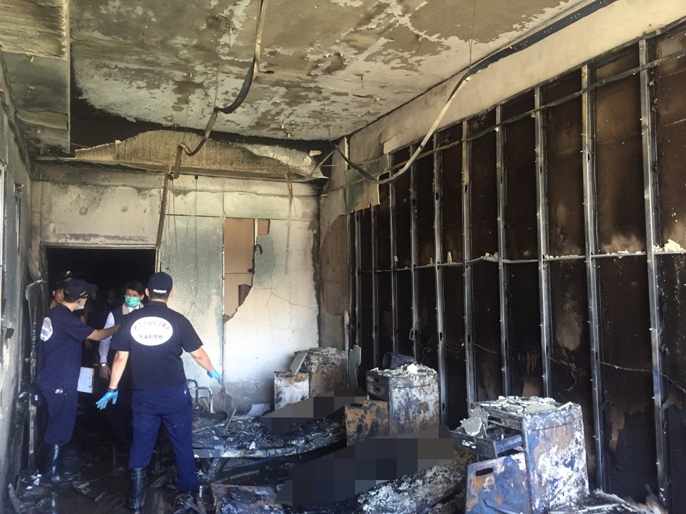 圖:新北市調查人員在火場調查起火原因,現場一片焦黑\中央社
