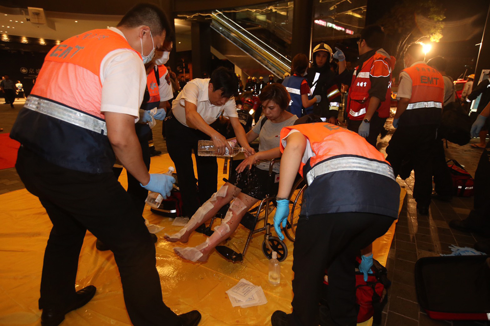 圖:台鐵車廂7日晚間行駛至松山車站附近時,突然車廂傳出爆炸聲,多人受傷。圖為警消為受傷民眾處理傷勢/中央社
