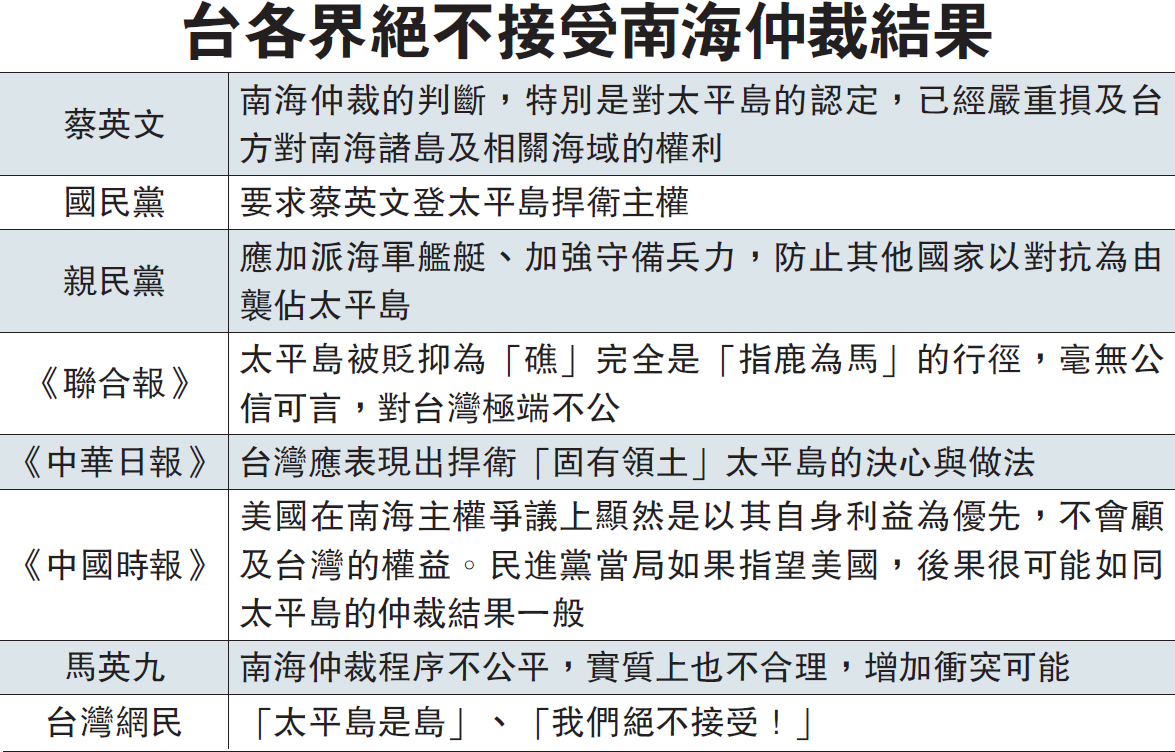 台各界絕不接受南海仲裁結果