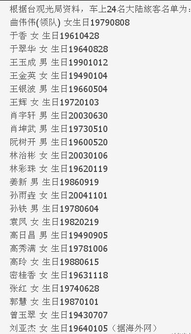 根據台觀光局資料,車上24名大陸旅客名單為: