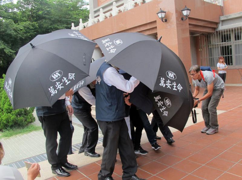 圖:火燒車司機蘇明成的家屬30日在層層傘陣阻擋下抱着骨灰罎進塔 中央社