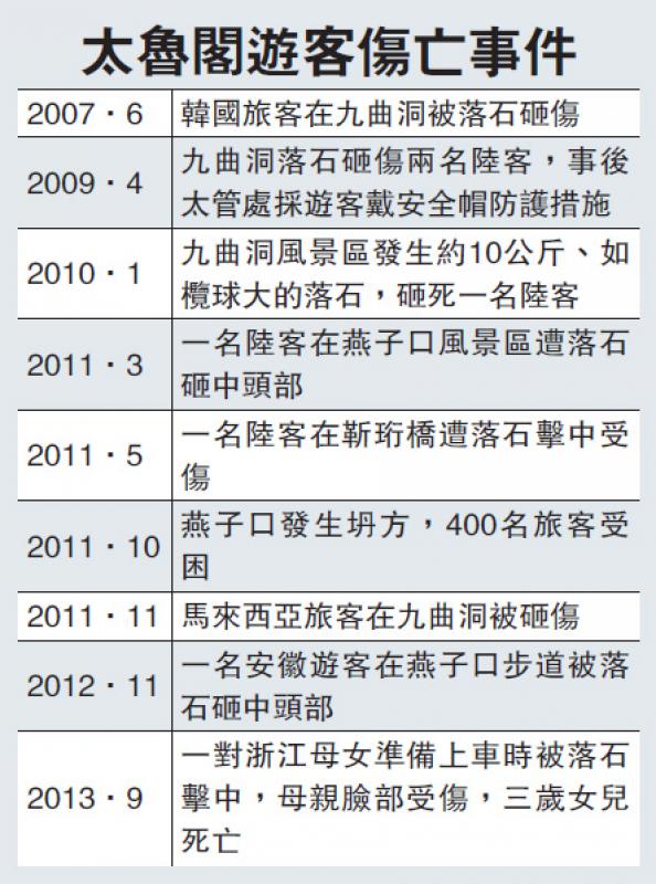 天降橫禍!1日下午1時40分許,一輛遊覽車行經花蓮太魯閣祥祿隧道西端(中橫公路路段),遭到一塊約2米見方的大岩石擊中。巨石穿過車頂當場砸死一名47歲的台灣女遊客王美珠,另有3名遊客也受傷。太魯閣公路是全球最危險的路段之一,經常發生滾石擊中車輛和遊客的意外事件。