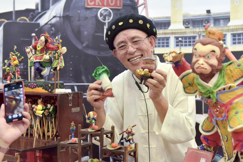 圖:在台灣美食展上,鹿港麵人大師施教鏞現場製作「翡翠白菜」和「五花肉」\中新社