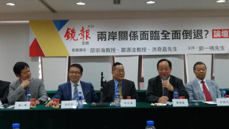 圖:《鏡報》月刊10日舉辦兩岸關係論壇。(左起)香港新聞工作者聯會副主席郭一鳴、前海基會董事長洪奇昌、澳門理工學院名譽教授邵宗海、全球客家崇正聯合總會名譽會長鄒源淦、香港新聞工作者聯會會長張國良等人出席了論壇\朱瑞宜攝