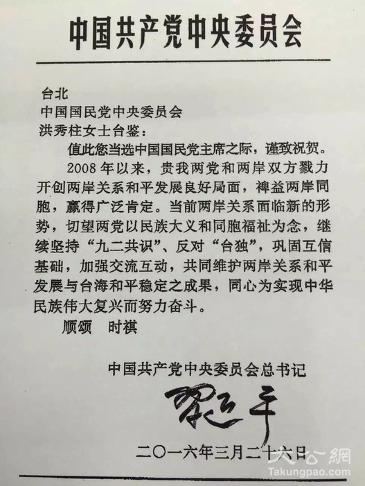 中共中央總書記習近平致電洪秀柱,祝賀她當選為中國國民黨黨主席