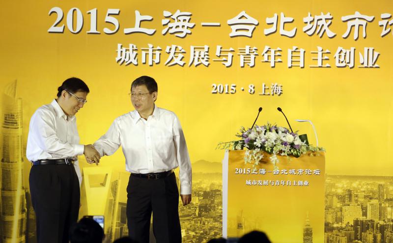 圖:去年上海台北城市論壇在上海舉行。圖為當時上海市長楊雄(右)與台北市長柯文哲出席論壇/資料圖片
