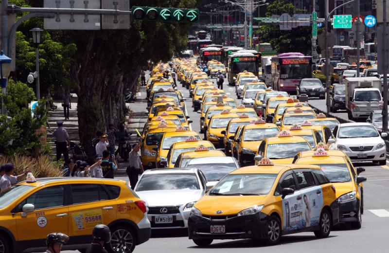 圖:台北上百輛的士12日包圍「行政院」抗議Uber/中央社