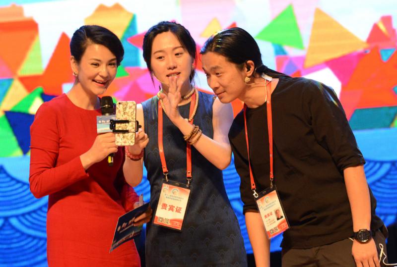 圖:海峽青年峰會14日在福州啟幕,台灣青年建築師鄧海(右)與大陸新銳導演陳潔(中)互動交流/中新社