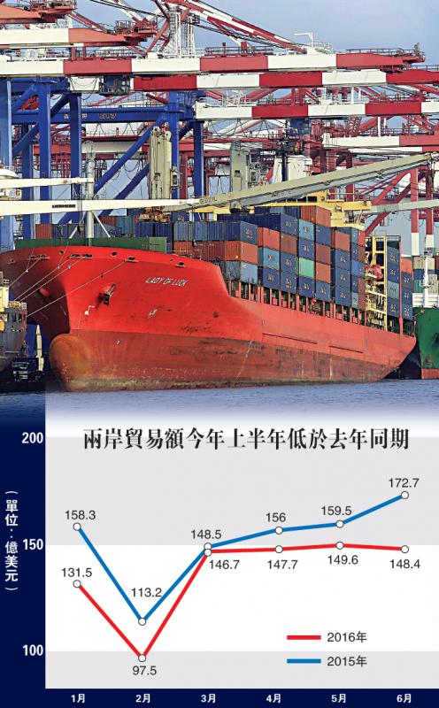 中國大陸商務部統計顯示,今年上半年兩岸貿易額同比下降近一成,其中6月同比下降更超過19%。此間權威專家受訪指出,除全球經濟疲軟、兩岸貿易結構轉型等原因外,島內政黨輪替帶來的兩岸關係不確定性對兩岸貿易投資的負面影響尤甚。