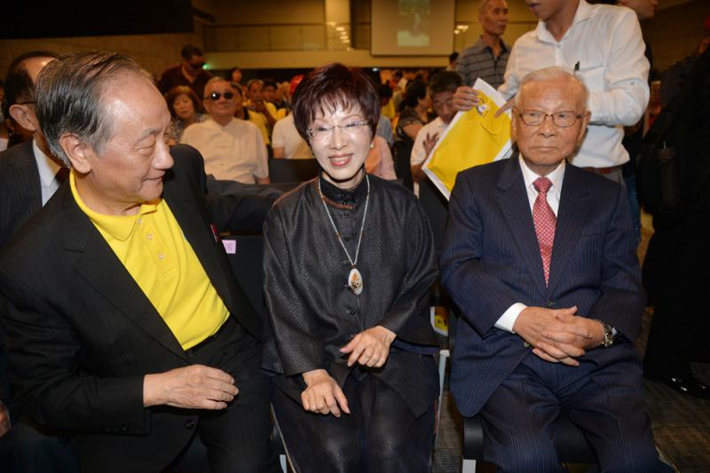 圖:新黨黨慶上,國民黨主席洪秀柱(中)與新黨主席郁慕明(左)呼籲泛藍支持者團結 中央社