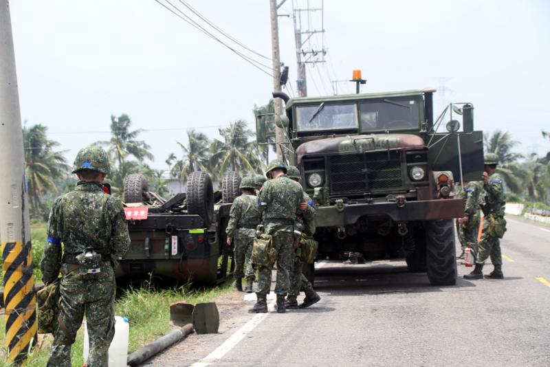 【大公報訊】台灣陸軍22日發生翻車意外,陸軍8軍團333旅一輛悍馬吉普車上午不慎翻落邊坡,一名駕駛兵額頭撞傷送醫。日前在漢光演習預演中一輛戰車翻覆造成4死1傷。漢光演習22日仍如期登場,將實施5天4夜連續攻、防對抗演練。