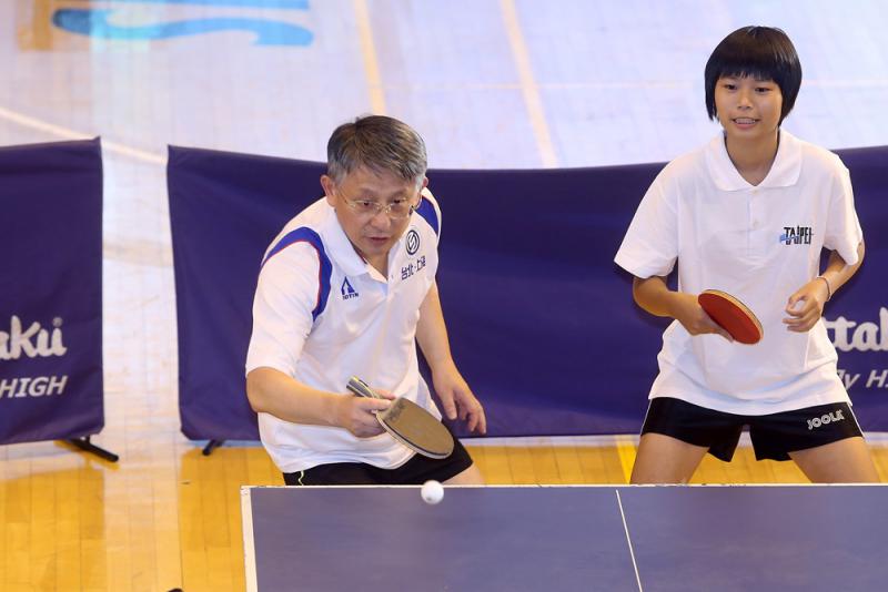 圖:沙海林(左)代表上海市長出席「台北上海城市論壇」。圖為他二十二日與台北中學生(右)打乒乓球友誼賽 中央社
