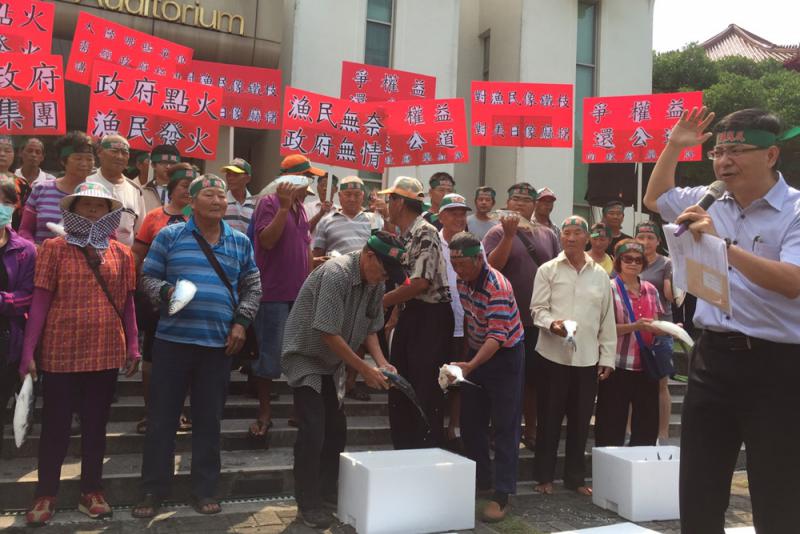 圖:台南市虱目魚養殖協會計劃到大陸洽談虱目魚契作合約受阻,漁民在市農業局外丟虱目魚抗議\中央社