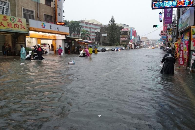 圖:台南6日中午大雨,導致市區多處路面積水\中央社