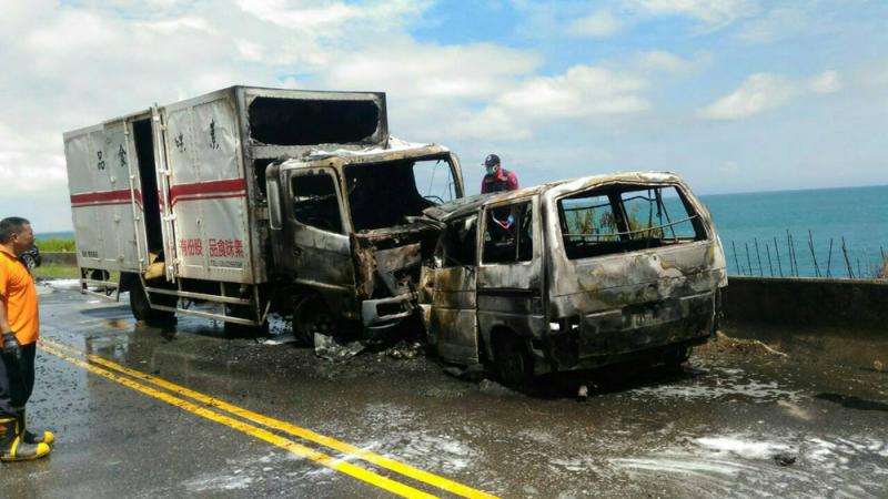 圖:對撞的小客車全車及貨車車頭均焚毀 中央社