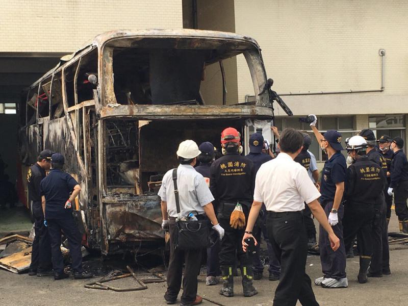 圖:台灣檢察機關日前宣布陸客團遊覽車火燒案是台灣司機自焚釀禍。圖為台灣警方檢查被燒毀的遊覽車 資料圖片