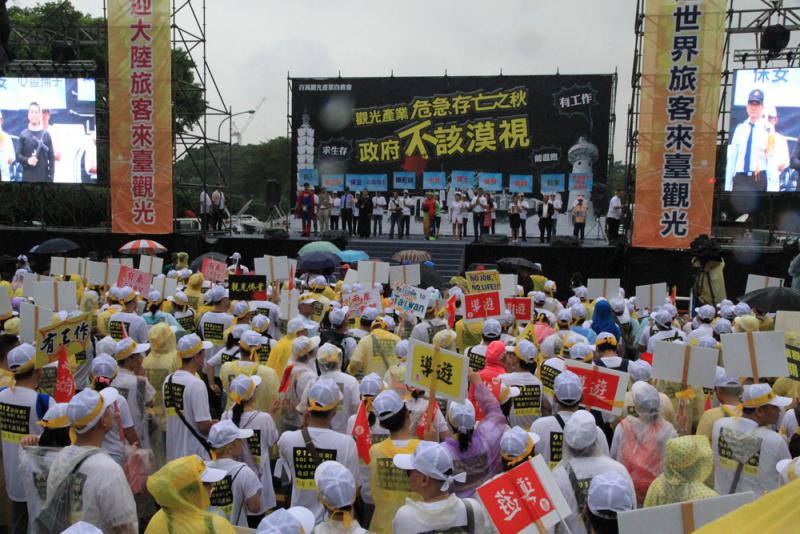 在凱達格蘭大道上搭建的活動舞台,兩旁懸掛大幅標語,表達「歡迎世界各地遊客,也歡迎大陸遊客來台觀光」。多位業界代表相繼上台表達心聲:遊客劇減,許多導遊和遊覽車司機處於失業和半失業狀態;業者陷入兩難選擇,裁員將使許多家庭出現生計問題,不裁員則有巨大經營壓力;當局要拿出更有效的政策因應。