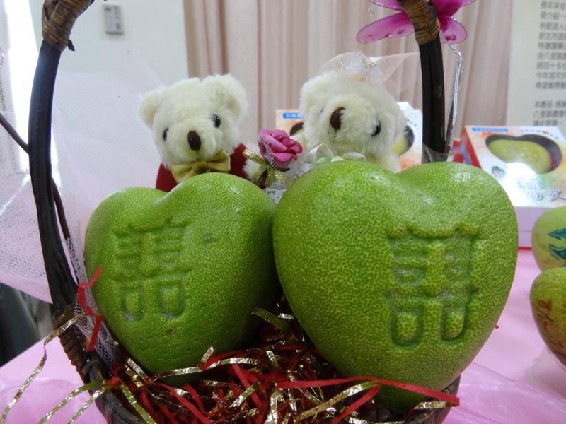 圖:新北市府農業局與八里區農會提升農產品價值,將當地特產文旦柚變成一顆顆心形造型的幸福柚,成為送禮表達心意最佳代表 中央社