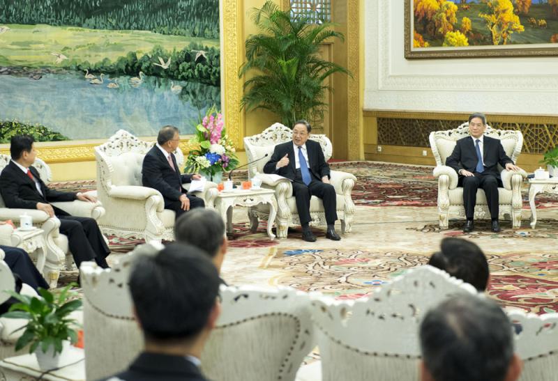 圖:中共中央政治局常委、全國政協主席俞正聲(右二)18日在北京人民大會堂會見台灣縣市長參訪團\新華社