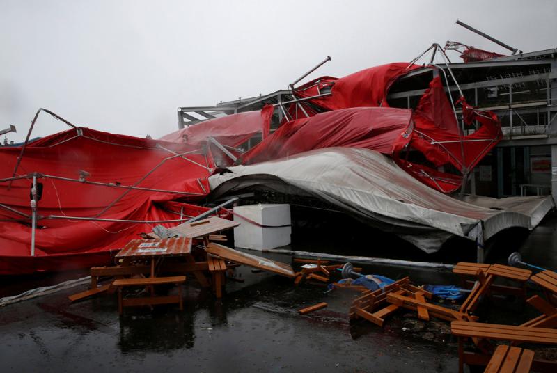 圖:「鮎魚」27日下午2時在台灣省花蓮市登陸。市內一建築物的帳篷和棚架被吹翻\路透社