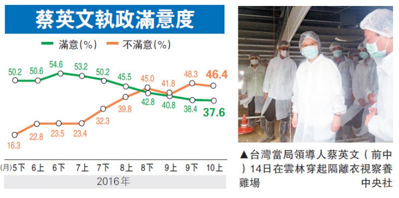 據中通社報道:綜合台灣媒體報道,台灣指標民調每半個月發布一次民調,當天發布10月上半月的民調顯示,對蔡英文執政表現有37.6%滿意、46.4%不滿意,相較9月下期正向評價降0.8個百分點,負面評價降1.9個百分點。