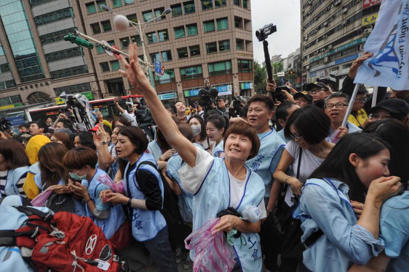 圖:華航空服員14日在華航台北分公司前砸蛋抗議,要求認定此前罷工後勞資雙方達成的協議/中央社