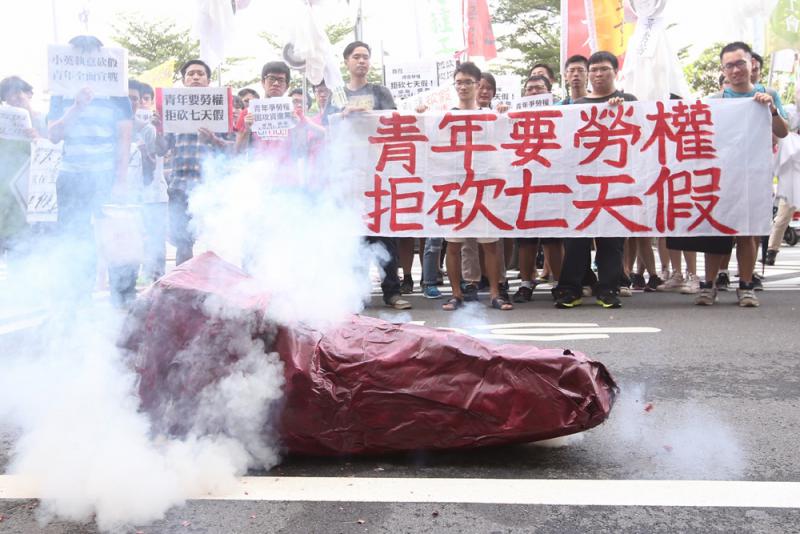 民進黨本月5日在一分鐘時間裏快速通過攸關「一例一休」、砍七天假的《勞基法》修正草案,24日將進行黨團協商。不滿綠營砍假的青年團體23日發起遊行,從「立法院」出發,步行至民進黨中央黨部抗議,拒絕以「一例一休」作為砍假的交換條件,並將道具「血汗之肝」送給民進黨,稱要與大選時號召青年投票的民進黨劃清界線。