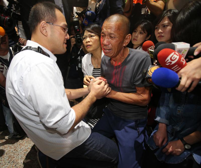 圖:沈瑞章(前右)26日終於返台,看到船長鍾徽德的兒子時痛哭下跪/中央社