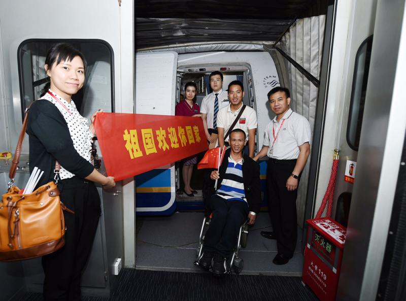 圖:被索馬里海盜劫持的阿曼籍台灣漁船的最後一名獲救中國船員(因健康原因未能於前日隨其他中國船員同機回國)二十七日在外交部工作組陪同下安全飛抵廣州\本報廣州傳真