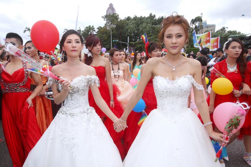 圖:29日,台灣同性伴侶穿婚紗參與「同志」遊行\中央社