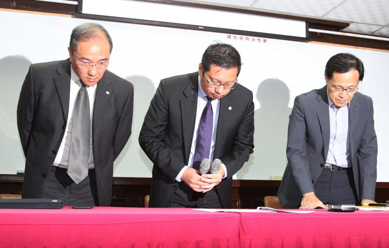 圖:復興航空22日舉行記者會,復航董事長林明昇(中)、執行長劉東明(左)、發言人劉忠繼(右)宣布解散公司並鞠躬道歉 中央社
